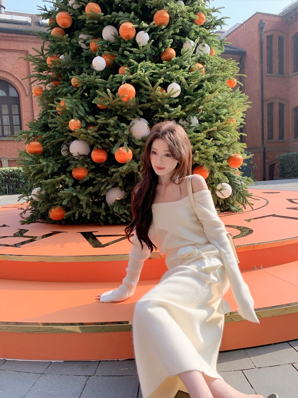 ByYou 冬季新款狐狸绒白色高腰针织半身裙修身长款过膝加厚毛衣裙