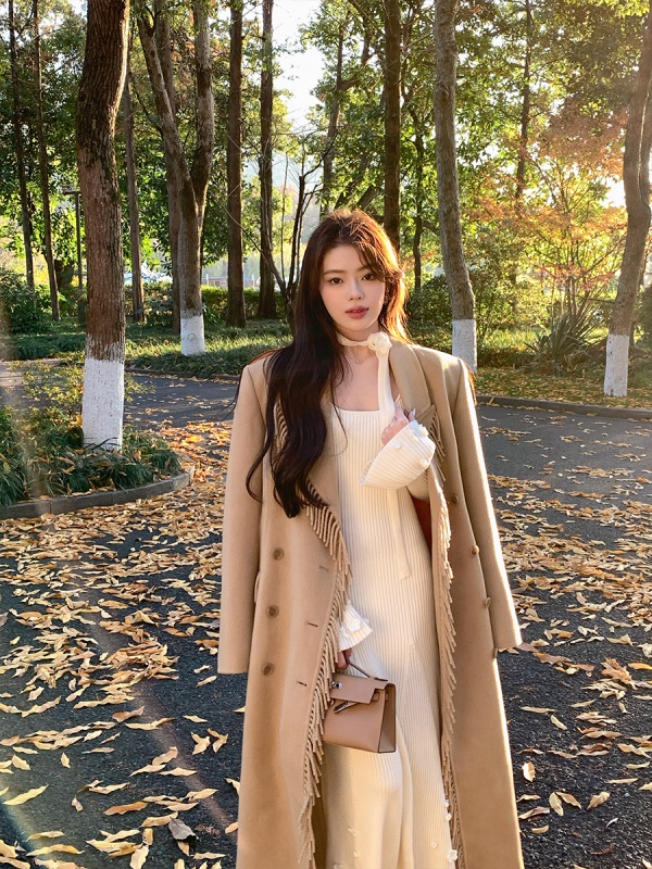 商品名称:ByYou 秋冬兔绒杏色喇叭袖挂脖针织连衣裙长款过膝加厚打底毛衣裙