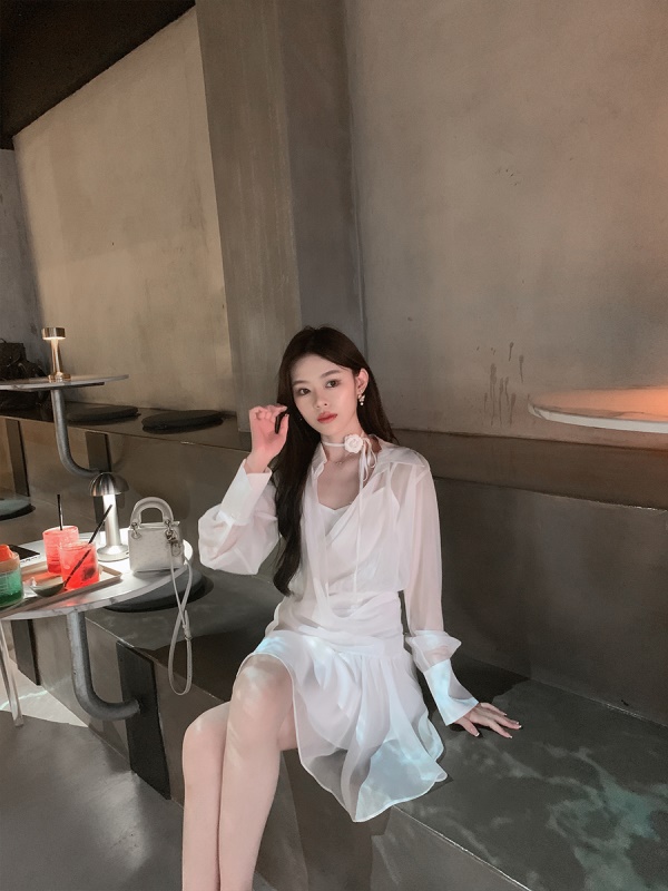 ByYou 秋冬新款喇叭袖翻领白色衬衫连衣裙收腰短裙含吊带裙两件套