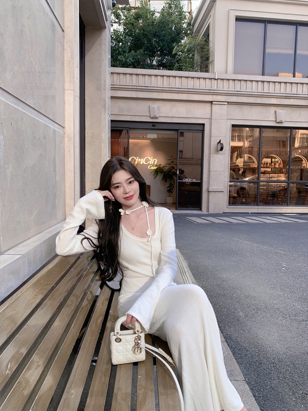 ByYou冬季新款气质U领白色羊毛针织连衣裙长款修身内搭包臀毛衣裙