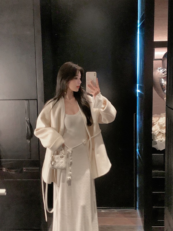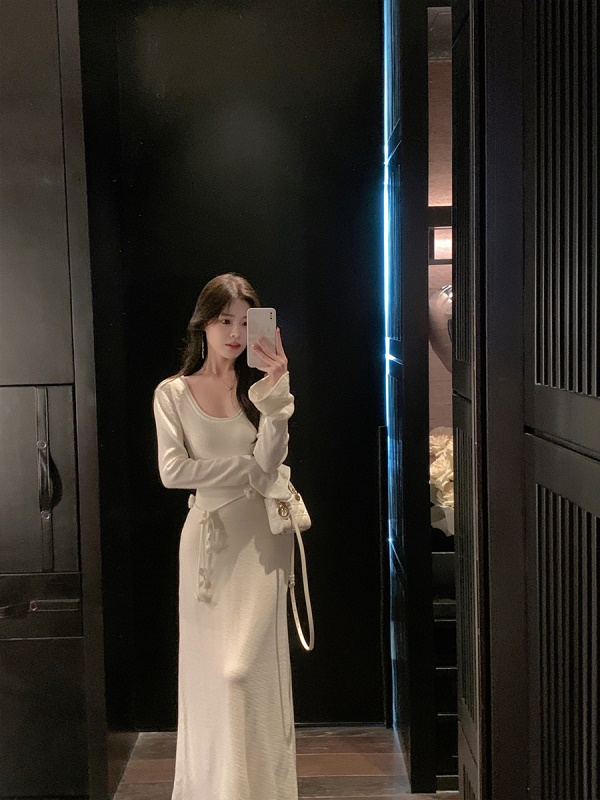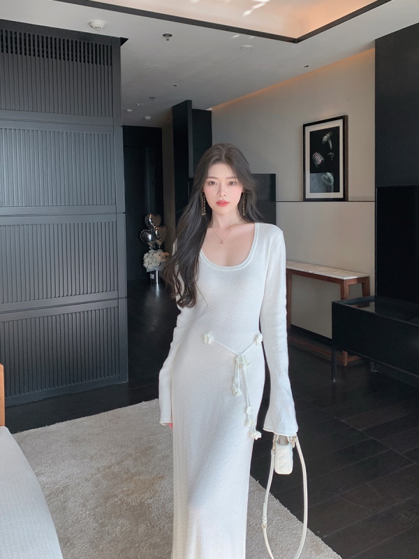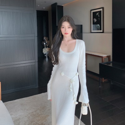 商品名称:ByYou冬季新款气质U领白色羊毛针织连衣裙长款修身内搭包臀毛衣裙