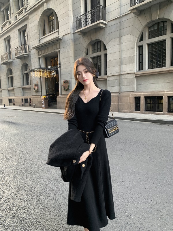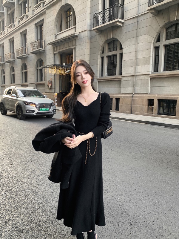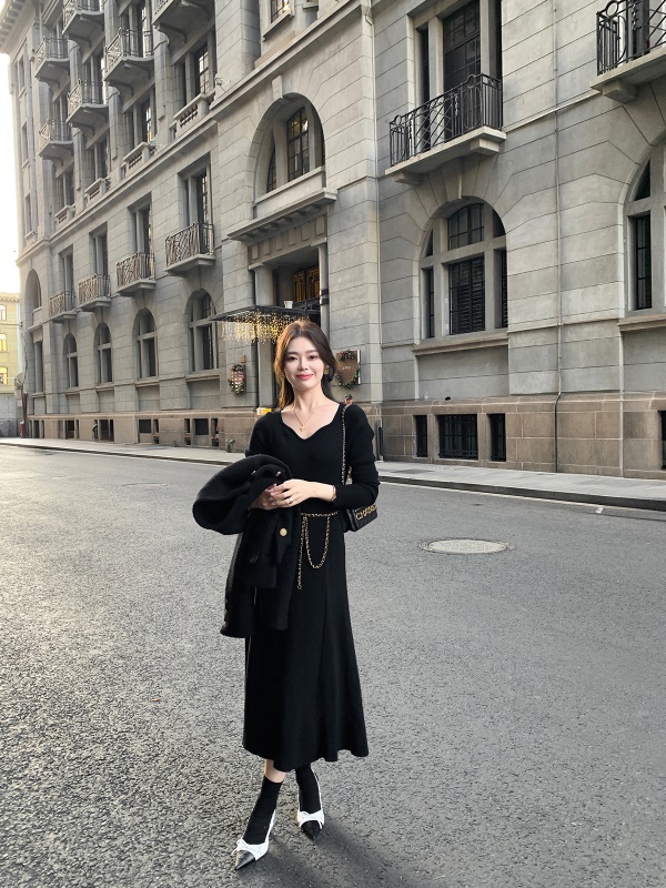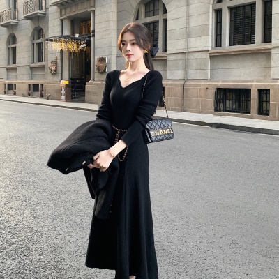 商品名称:ByYou2025新款v领黑色兔绒针织打底连衣裙垂感长款修身内搭毛衣裙