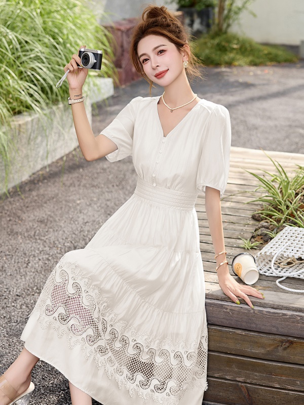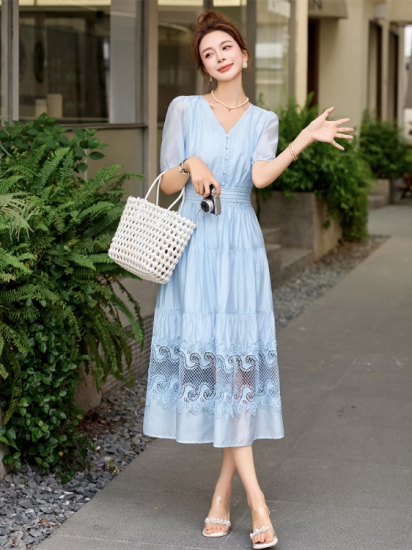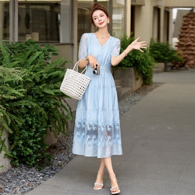 商品名称:新中式绝美天丝连衣裙女2025夏季新款独特漂亮掐腰蕾丝镂空长裙子