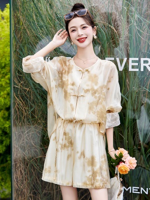 新中式印花雪纺凉快套装女2025夏季新款遮肚子漂亮时尚短裤两件套