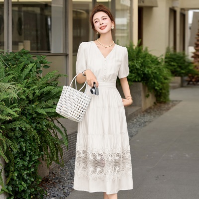 法式初恋白色波点泡泡袖V领连衣裙女夏季独特漂亮小个子收腰裙子