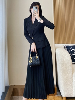 秋季新款高级感黑色长袖西装连衣裙职业显瘦收腰假两件百褶长裙子