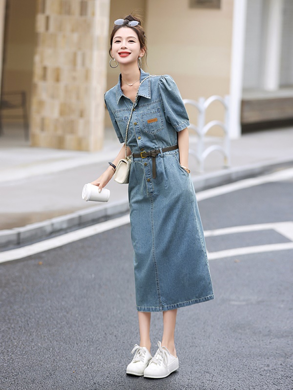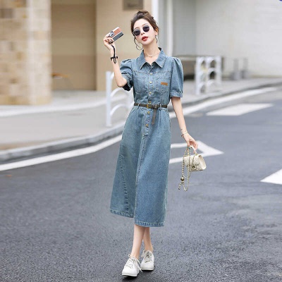 欧货时尚牛仔连衣裙女2025夏季新款修身洋气减龄泡泡袖衬衫中长裙