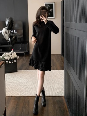 秋冬季黑色加绒加厚气质连衣裙高级感长袖宽松显瘦减龄裙子小个子