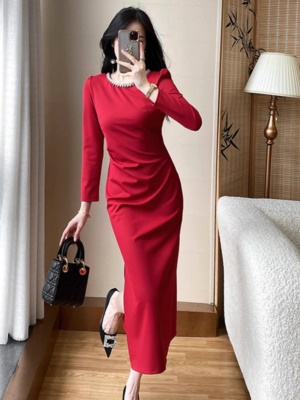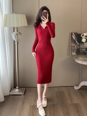 红色新年V领针织毛衣连衣裙女秋冬修身显瘦内搭打底配大衣的裙子