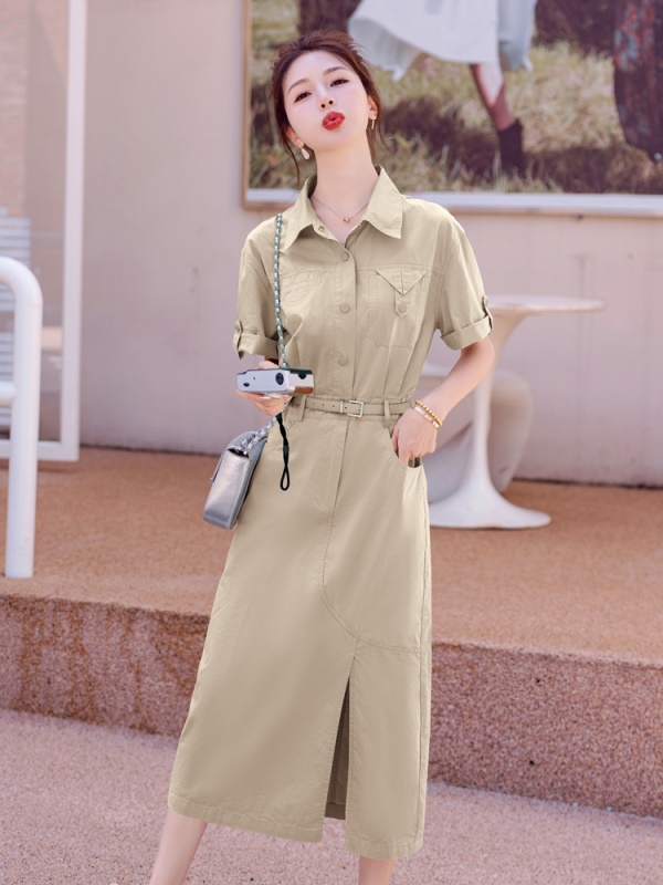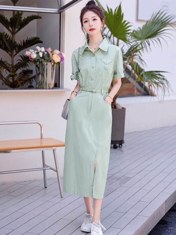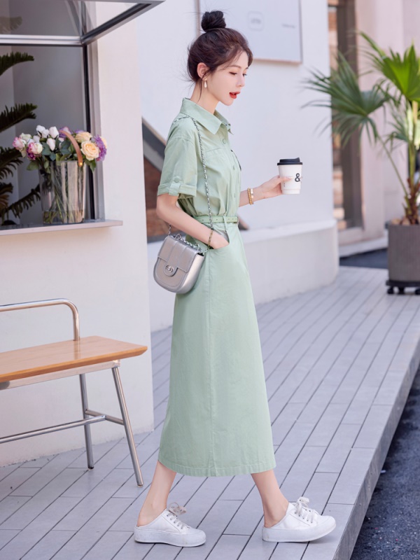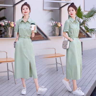 工装衬衣连衣裙女夏装新款气质翻领休闲水洗棉透气薄荷绿爆款长裙