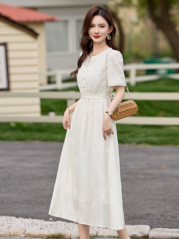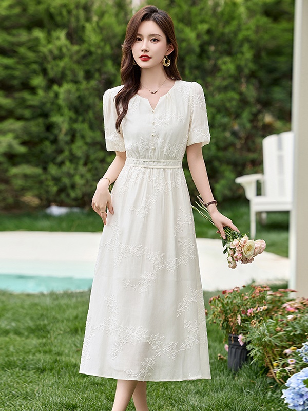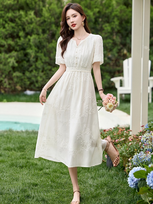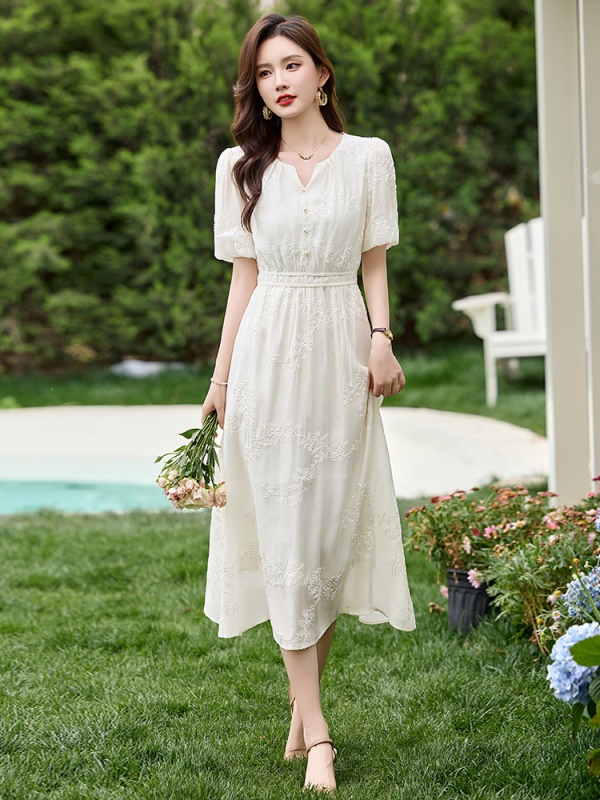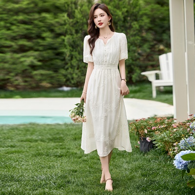 商品名称:法式白色掐腰连衣裙女2025夏季新款刺绣V领名媛泡泡袖高级感长裙