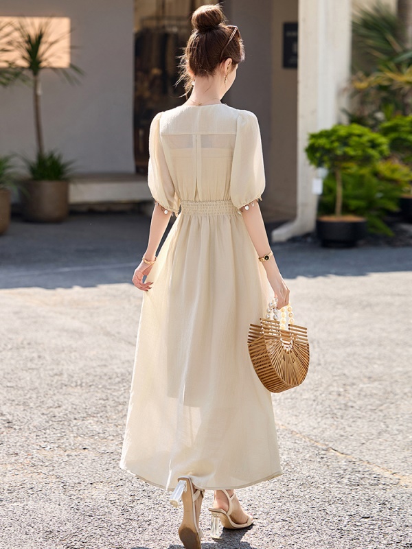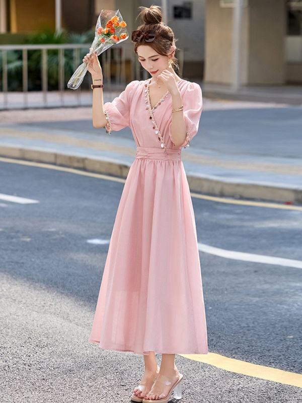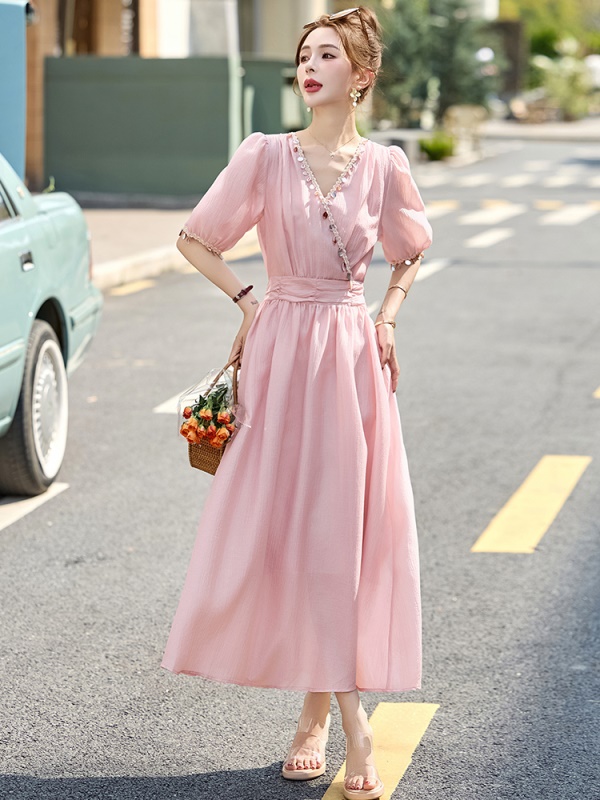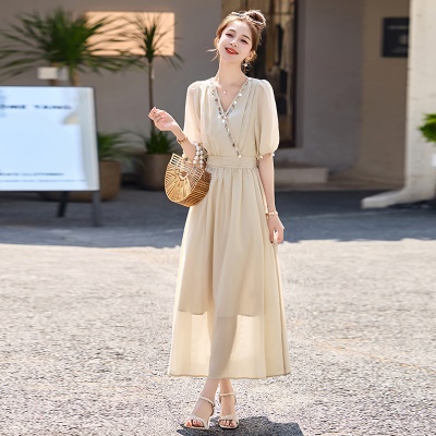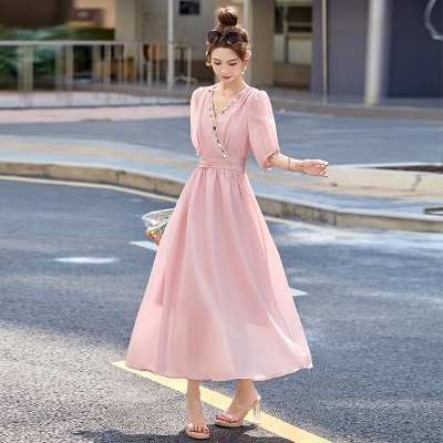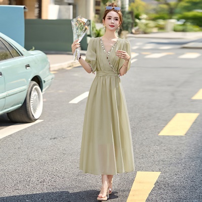 商品名称:法式气质V领连衣裙女2025夏季新款高级感串珠褶皱收腰温柔风长裙