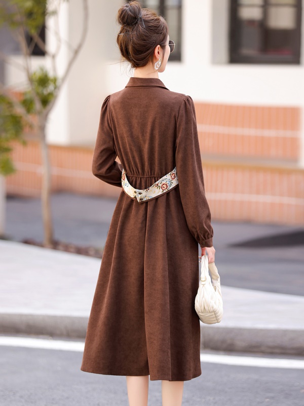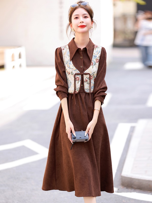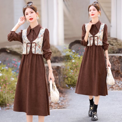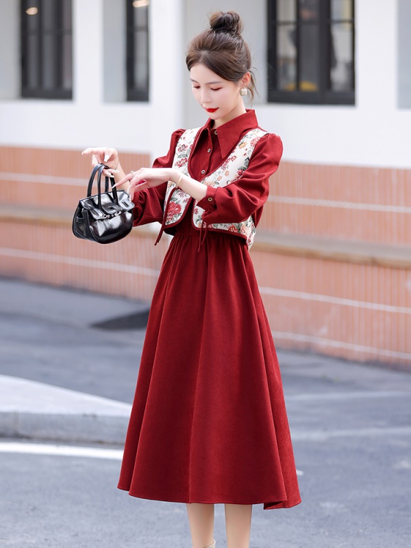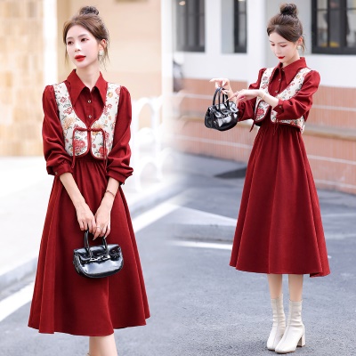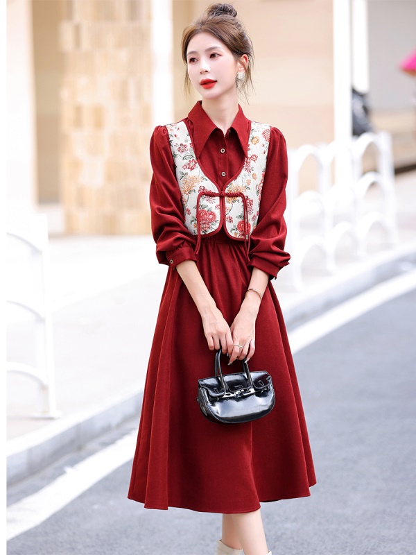 商品名称:时尚酒红色衬衫连衣裙女2025新款秋冬装新中式盘扣国风两件套长裙