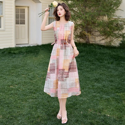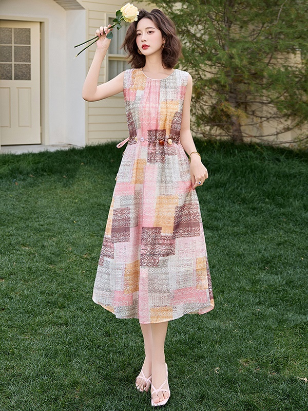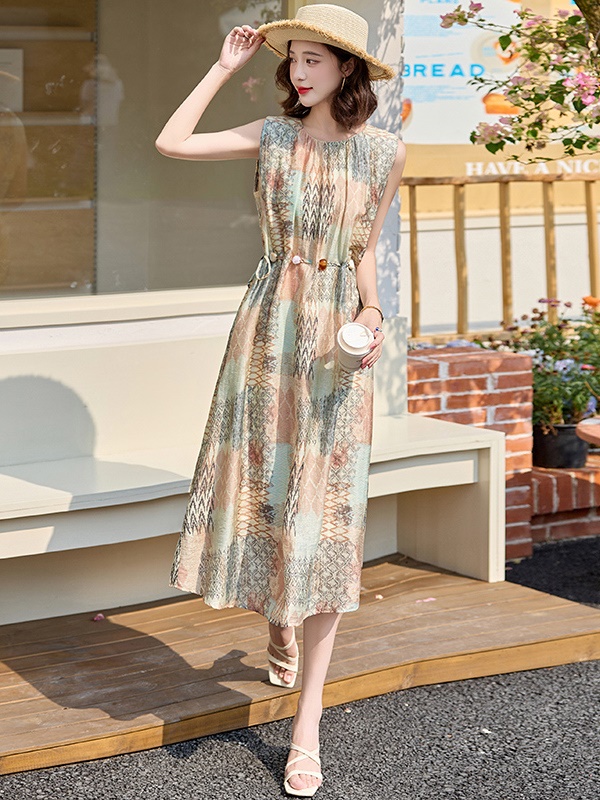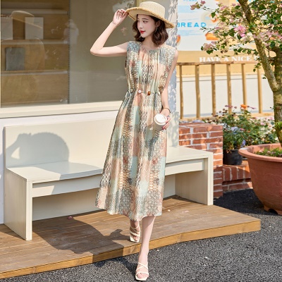 法式印花无袖天丝连衣裙女2025夏新款气质独特串珠掐腰波西米亚裙