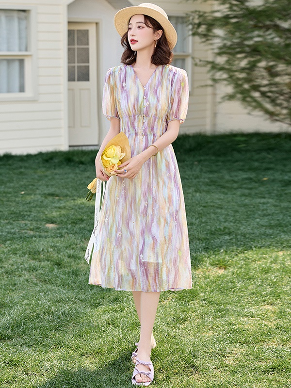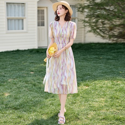 女装夏季多巴胺裙子减龄显瘦长裙法式黄色V领收腰a字连衣裙高级感