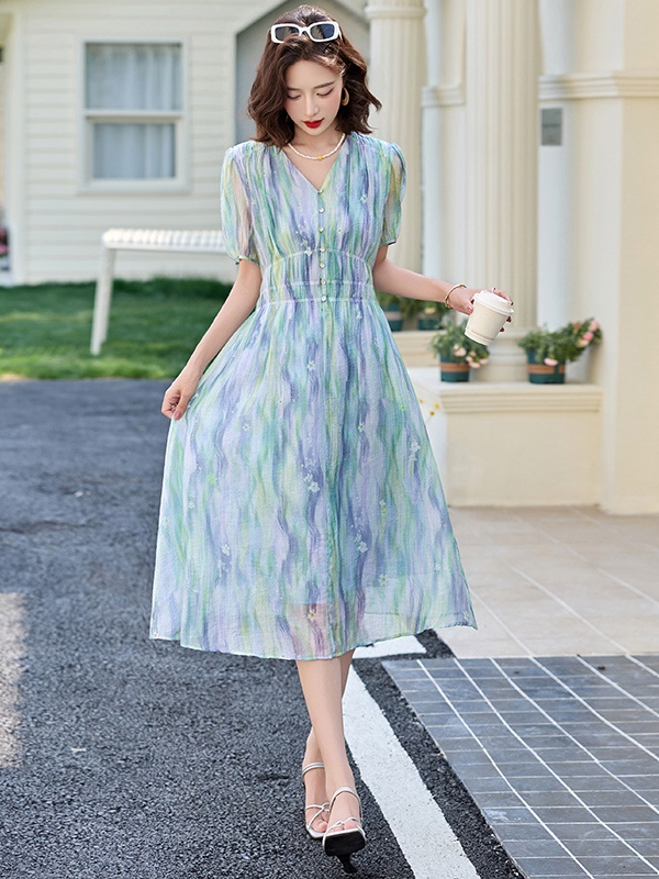 莱赛尔天丝印花连衣裙女2025夏装新款今年流行爆款漂亮掐腰长裙子