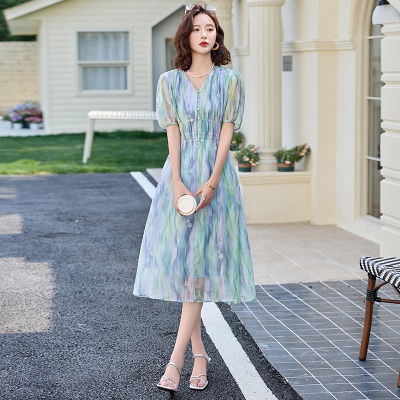 商品名称:莱赛尔天丝印花连衣裙女2025夏装新款今年流行爆款漂亮掐腰长裙子