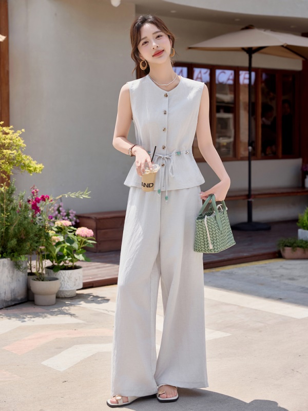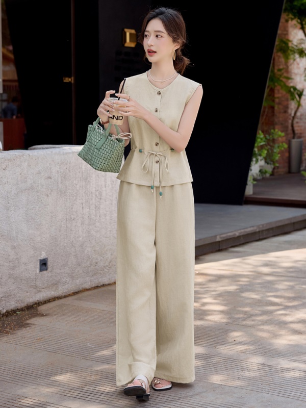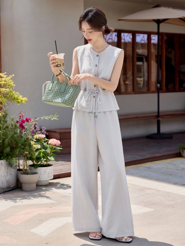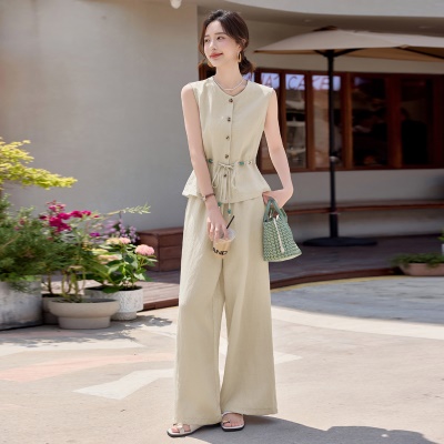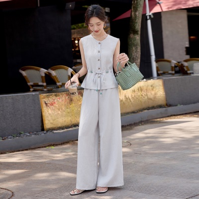 商品名称:小香风无袖亚麻套装女夏2025新款轻奢高端系带收腰麻料气质两件套