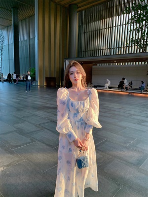 ByYou 夏季新款法式方领泡泡袖蓝色碎花天丝连衣裙长款收腰仙女裙