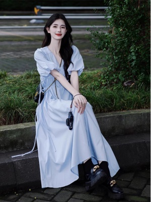 茶歇法式蓝色V领泡泡袖连衣裙女夏季多巴胺收腰显瘦气质超仙裙子