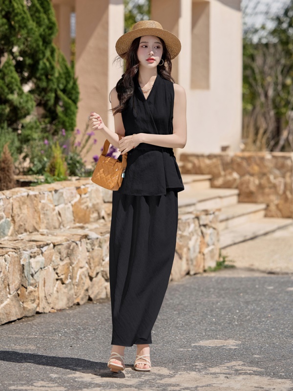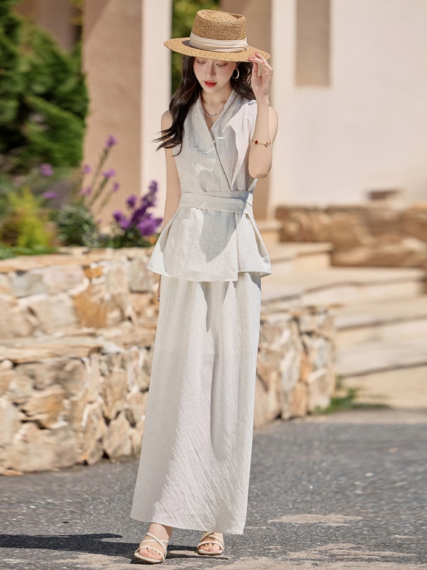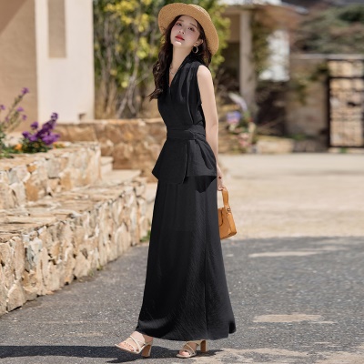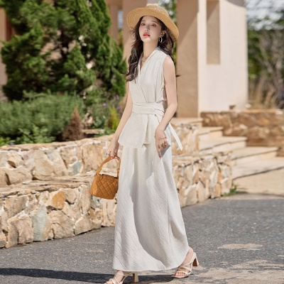 商品名称:法式气质无袖套装女2025夏季新款欧若风收腰显瘦棉麻长裙两件套