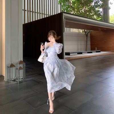 ByYou2025新款早春青花瓷系列高级感气质碎花连衣裙收腰长款a字裙