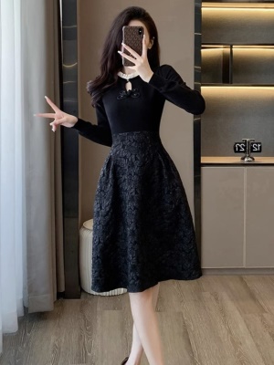 秋冬季2025新款女黑色旗袍领连衣裙高级感修身显瘦法式赫本小黑裙