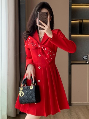 2025年秋季新款法式气质名媛红色小礼服高端奢华百褶西装连衣裙女