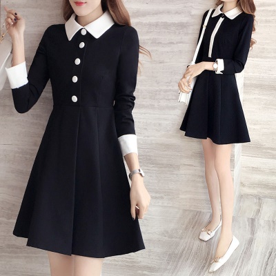 秋季黑色长袖职业OL通勤连衣裙小个子娃娃领心机小黑裙赫本风短裙