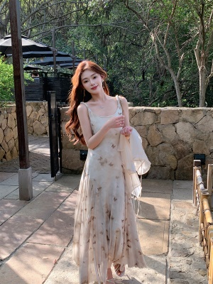ByYou 夏季新款度假风杏白色碎花吊带连衣裙收腰修身印花大摆长裙