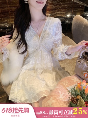 精致小香风钉珠蕾丝连衣裙女春秋新款加绒打底裙子