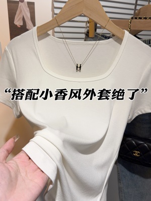 高端精致方领白色短袖t恤女装夏季锁骨显瘦小众U型下摆上衣打底衫