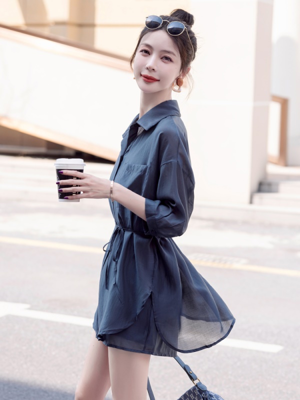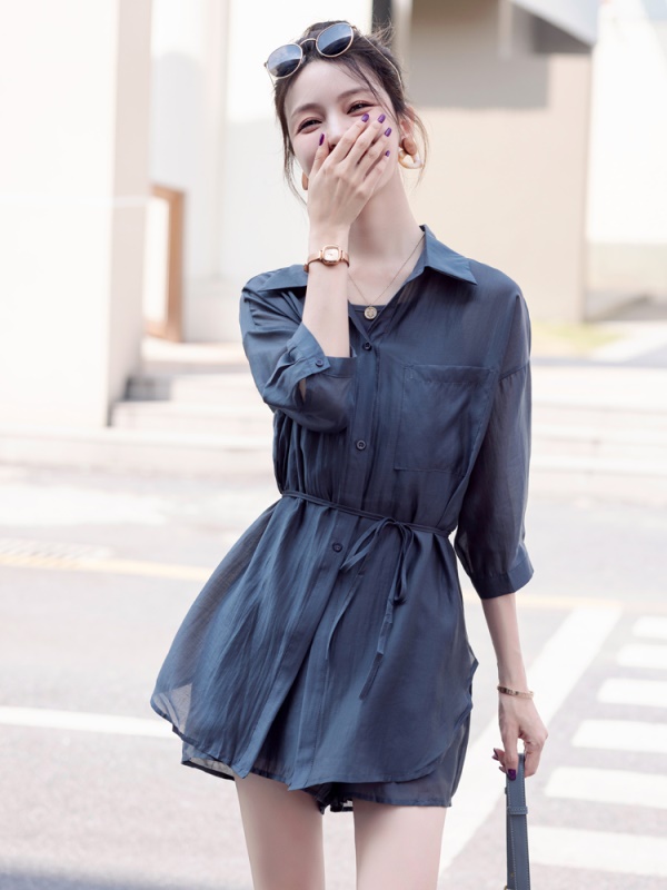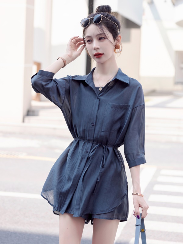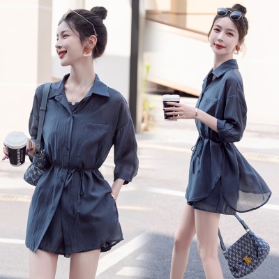 商品名称:小个子套装遮肉夏季女2025新款炸街高级感显瘦衬衣薄纱短裤三件套