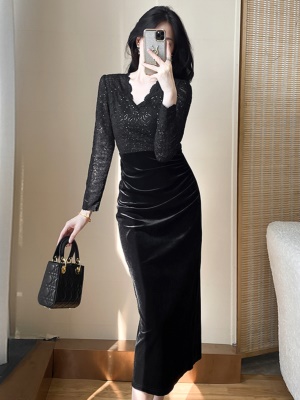 丝绒连衣裙秋季新款高档黑色V领修身显瘦包臀中长款宴会晚礼服裙