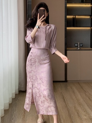 富贵改良禅意旗袍套装紫色新中式国风半身裙包臀盘扣开衩裙子女夏