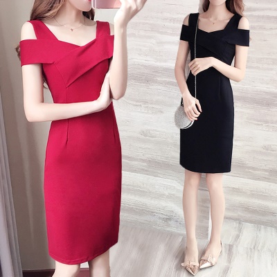 2025流行夏新款有气质的红色一字肩连衣裙修身显瘦露肩吊带包臀裙