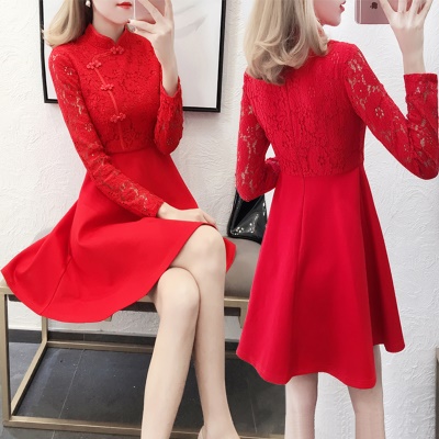 蕾丝大红色礼服裙女2025新款改良旗袍回门服新娘宴会订婚连衣裙子