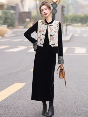 新中式国风套装裙女2025春季新款端庄大气高档丝绒刺绣马甲三件套