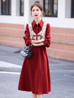 时尚酒红色衬衫连衣裙女2025新款秋冬装新中式盘扣国风两件套长裙