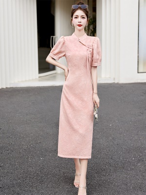 中国风盘扣连衣裙2025夏季新款名媛泡泡袖轻奢复古洋气镂空旗袍裙