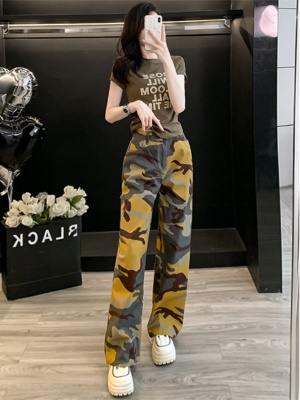 美式休闲时尚套装女夏季新款时髦炸街短袖T恤迷彩阔腿裤两件套潮