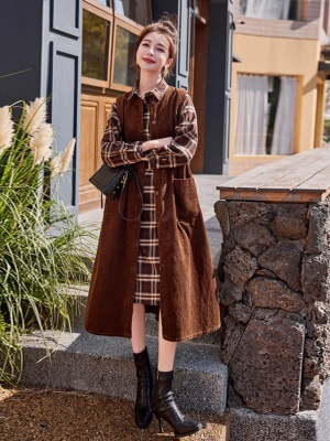 美拉德灯芯绒马甲连衣裙套装女2025年春季新款格子时尚高档两件套