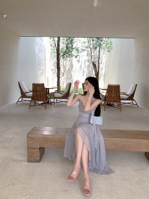 ByYou 夏季新款高级感灰色荡领雪纺吊带连衣裙气质收腰显瘦仙女裙