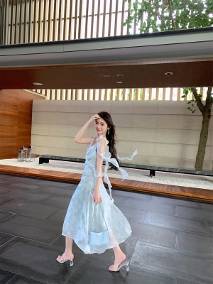 ByYou 夏季流苏蓝色晕染碎花雪纺吊带连衣裙中长款收腰无袖背心裙