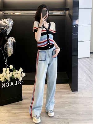 休闲时尚炸街洋气减龄套装女夏季新款条纹V领针织衫牛仔裤两件套