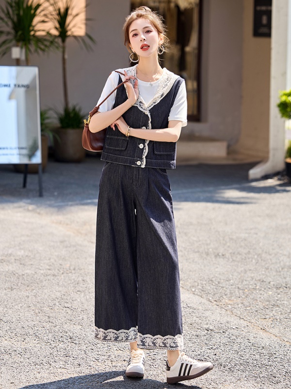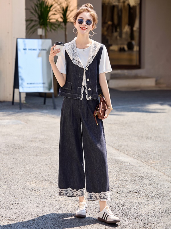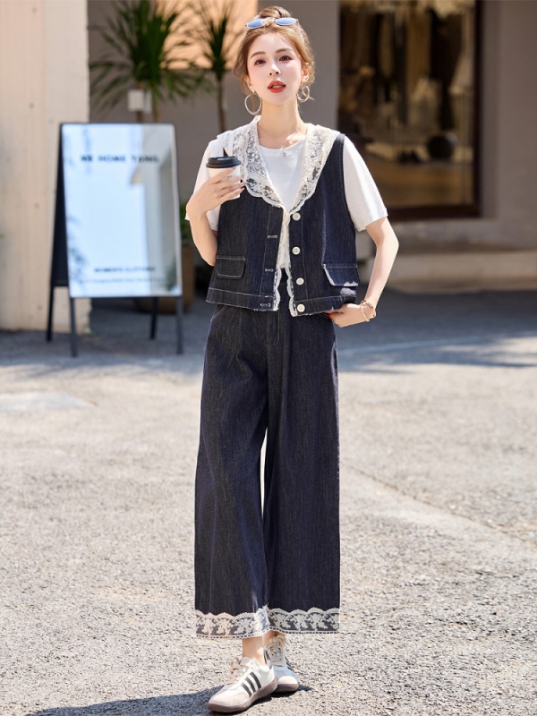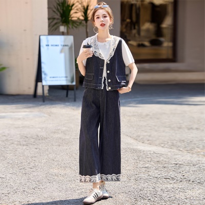 商品名称:设计感蕾丝连帽马甲套装女2025夏季新款欧货时尚阔腿裤薄款三件套