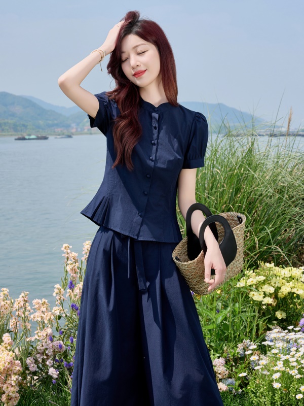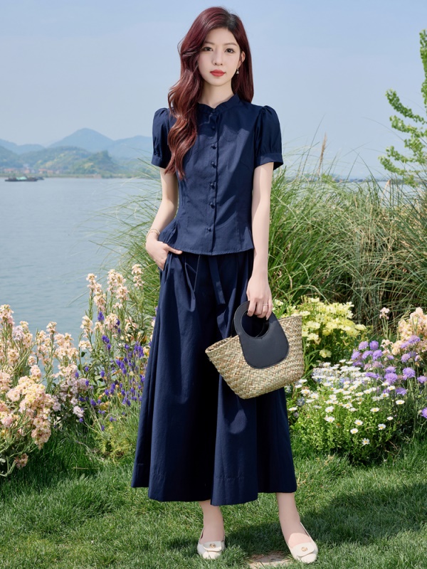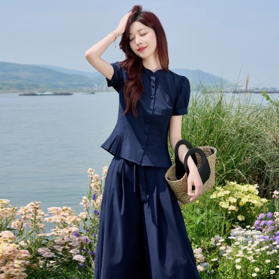 夏季新款时尚今年流行套装中式国风短裤V领上衣两件套小个子洋气