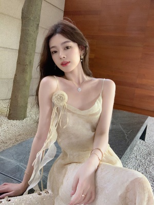 ByYou 夏季新款气质黄色天丝荡领吊带连衣裙收腰仙气印花长款裙子