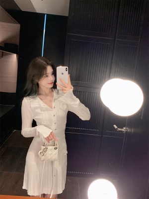 ByYou 秋冬新款翻领白色羊毛镂空针织连衣裙短款收腰显瘦百褶裙子