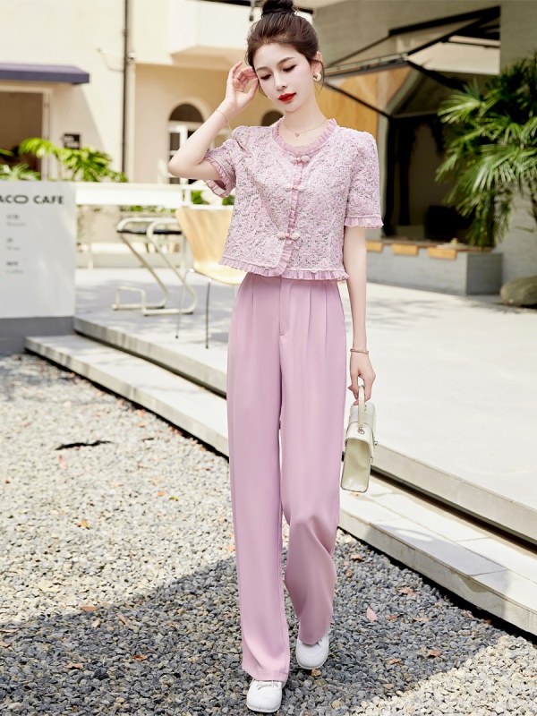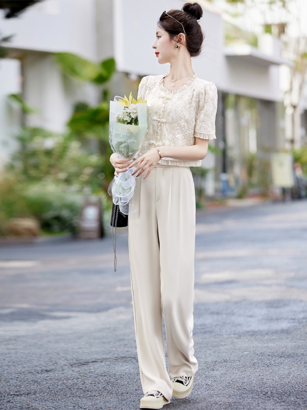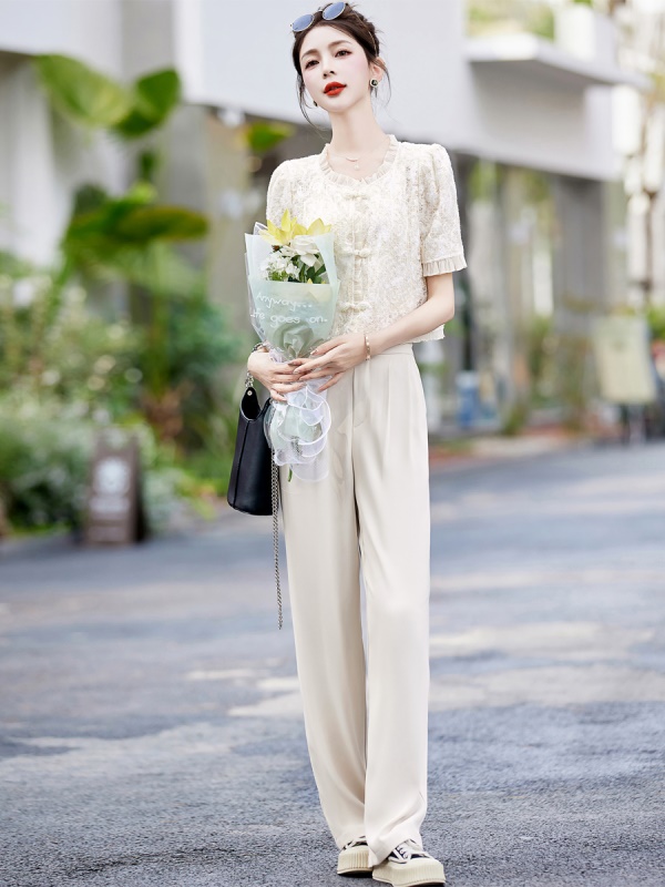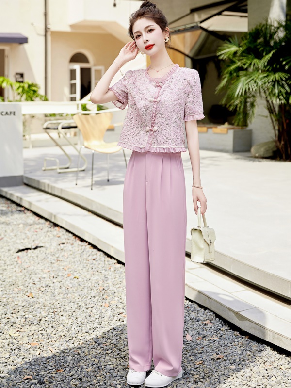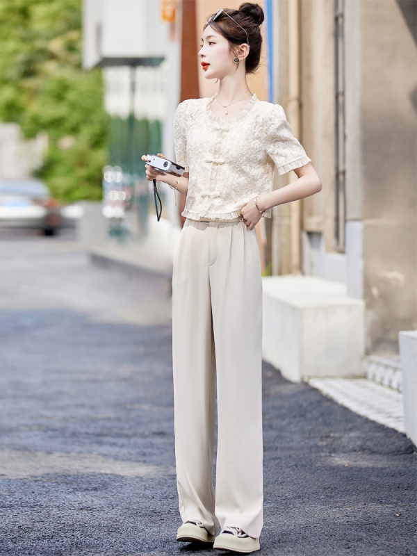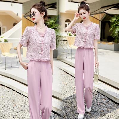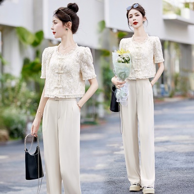 商品名称:2025夏装俏皮活泼减龄两件套名媛蕾丝上衣高级感西装阔腿裤套装女